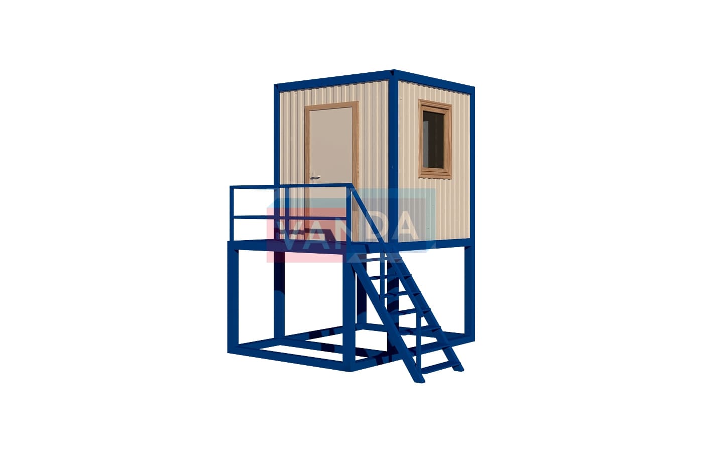 Пост охраны на подиуме №2 (вариант 1) изготавливается из несущего каркаса (верхняя и нижняя обвязка): швеллер 100х50х3 мм., угловые стойки: сложно - гнутый угол 90х90х3 мм., крыша блок-контейнера: металл сварной 0,9-1 мм., качественная наружная отделка: оцинкованный профлист, вспомогательный деревянный каркас (стены) выполнен из брусок 40х75 мм., лаги пола: обрезная доска 40х100 мм., лаги потолка: обрезная доска 40х100 мм., выполнено утепление: Минеральная вата «ISOVER» – 50 мм. и пароизоляция: плёнка техническая, черновой пол состоит из: обрезная доска 20 мм. (2 сорт), чистовой пол покрыт: ДСП строительное 16 мм., отделка пола выполнена из качественных материалов. Контейнер комплектуется окнами: деревянное, двойное остекление 800х1000, входной дверью: ДГ 21-8 обшита снаружи оцинкованным листом, врезной замок и внутренними дверями. Если в БК присутствуют перегородки, то для них используется: брусок 40х50 мм. Лестница постамента имеет перила, тетива лестницы выполнена из профтрубы 30х60 мм., ступени из уголка 25х25х3 мм., просечной лист, перила из профтрубы 20х40 мм., площадка перед входной дверью имеет ограждение.